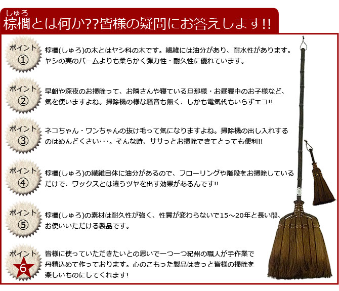 商品情報 ■7玉長柄箒 ■長さ:約125cm前後 ■4玉荒神箒(トサカ) 中 ■長さ:約27cm前後 ■棕櫚束子 中 ■長さ:約12cm前後 ■保存方法:棕櫚ほうきは大事に使用すれば10年20年と長持ちすると言われていますが、床に立て掛けておくと穂先に癖がついてしまいます。